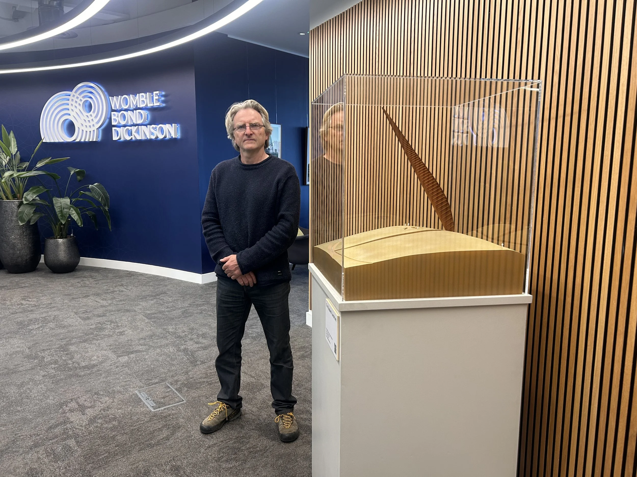 The sculptor behind The Elizabeth Landmark, Simon Hitchens with the scale model of the landmark at Womble Bond Dickinson
